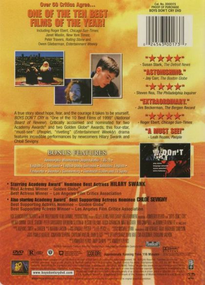 This fascinating story was based on real-life events (as documented in The Brandon Teena Story) that occurred in 1993 and ended in tragedy: Brandon's rape and murder by two of his supposed friends. Despite this horrible outcome, however, in the hands of director Kimberly Peirce (who cowrote the unfettered screenplay with Andy Bienen), Brandon's story becomes not oppressive or preachy, but rather oddly and touchingly transcendent, anchored by Hilary Swank's phenomenal, unsentimental performance. Swank inhabits Brandon's contradictions and passions with a natural vitality most actresses would refuse to give themselves over to. Brandon's deception is doomed from the start, but Swank's enthusiasm is infectious, and when Brandon starts romancing the sloe-eyed Lana (a pitch-perfect Chloë Sevigny), he finds a soul mate who wants to transcend boundaries and fated identities as much as he does. The last part of the film, when Brandon's true identity is discovered, is truly painful to watch, but in between the agony there are touching moments of sweetness between Brandon and Lana, who wrestles with the truth of who Brandon actually is. You'll come away from Boys Don't Cry with affection and respect for Brandon, not pity. --Mark Englehart