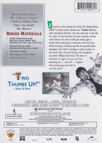 Before Kevin Smith became a Hollywood darling with Chasing Amy, a film he wrote and directed, he made this $27,000 comedy about real-life experiences working for chump change at a New Jersey convenience store. A rude, foul-mouthed collection of anecdotes about the responsibilities that go with being on the wrong side of the till, the film is also a relationship story that takes some hilarious turns once the lovers start revealing their sexual histories to one another. In the best tradition of first-time, ultra-low budget independent films, Smith uses Clerks as an audition piece, demonstrating that he not only can handle two-character comedy but also has an eye for action--as proven in a smoothly handled rooftop hockey scene. Smith himself appears as a silent figure who hangs out on the fringes of the store's property.