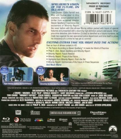 Set in the chillingly possible future of 2054, Steven Spielberg's Minority Report is arguably the most intelligently provocative sci-fi thriller since Blade Runner. Like Ridley Scott's "future noir" classic, Spielberg's gritty vision was freely adapted from a story by Philip K. Dick, with its central premise of "Precrime" law enforcement, totally reliant on three isolated human "precogs" capable (due to drug-related mutation) of envisioning murders before they're committed. As Precrime's confident captain, Tom Cruise preempts these killings like a true action hero, only to run for his life when he is himself implicated in one of the precogs' visions. Inspired by the brainstorming of expert futurists, Spielberg packs this paranoid chase with potential conspirators (Max Von Sydow, Colin Farrell), domestic tragedy, and a heartbreaking precog pawn (Samantha Morton), while Cruise's performance gains depth and substance with each passing scene. Making judicious use of astonishing special effects, Minority Report brilliantly extrapolates a future that's utterly convincing, and too close for comfort. --Jeff Shannon