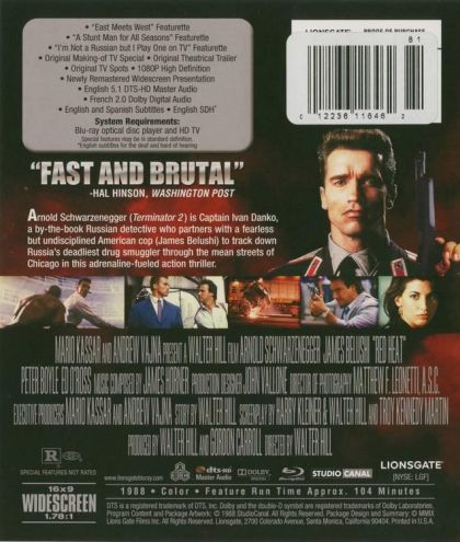 After scoring a hit with the Eddie Murphy-Nick Nolte cop thriller 48 Hours, director Walter Hill returned to the buddy formula with this half-ridiculous, half-invigorating action flick about humorless Russian cop Ivan Danko (Arnold Schwarzenegger). He follows a drug dealer from Moscow to Chicago, where he's matched up with city cop Art Ridzik (James Belushi), whose work ethic is considerably more relaxed. Most of the humor revolves around Danko's grumpy reaction to good ol' American capitalism, while Ridzik urges him to chill out. Red Heat is not bad as action comedies go, but only if you get into the absurd spirit of this predictable fare, in which the unlikely buddies get to wisecrack and act casually while mayhem erupts everywhere they go. Incidentally, Red Heat was the first American film allowed to shoot in Moscow's Red Square. --Jeff Shannon