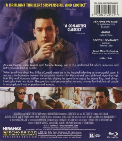 When con artist Roy Dillon (Cusack) is visited by his Mother, Lilly (Huston), who is also a con artist, she sends Roy off to the hospital because of a blow to the gut he suffered while working the grift. Roy's girlfriend, Myra (Bening), the third con artist, comes to visit Roy, and we discover that Lilly and Myra don't get along. After he is released from the hospital, Roy and Myra go on a little trip, where he is propositioned to be partners in crime with Myra. Everything soon falls apart for the three con artists, which leads to a bloody climax. Written by Justin Sharp