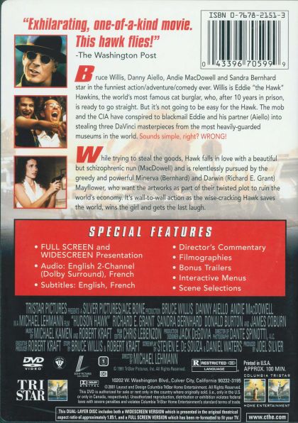 Eddie Hawkins, called Hudson Hawk has just been released from ten years of prison and is planning to spend the rest of his life honestly. But then the crazy Mayflower couple blackmail him to steal some of the works of Leonardo da Vinci. If he refuses, they threaten to kill his friend Tommy. Written by Harald Mayr {marvin@bike.augusta.de}