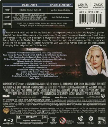 In a time when it seems that every other movie makes some claim to being a film noir, L.A. Confidential is the real thing--a gritty, sordid tale of sex, scandal, betrayal, and corruption of all sorts (police, political, press--and, of course, very personal) in 1940s Hollywood. The Oscar-winning screenplay is actually based on several titles in James Ellroy's series of chronological thriller novels (including the title volume, The Big Nowhere, and White Jazz)--a compelling blend of L.A. history and pulp fiction that has earned it comparisons to the greatest of all Technicolor noir films, Chinatown. Kim Basinger richly deserved her Supporting Actress Oscar for her portrayal of a conflicted femme fatale; unfortunately, her male costars are so uniformly fine that they may have canceled each other out with the Academy voters: Russell Crowe, Guy Pearce, Kevin Spacey, and James Cromwell play LAPD officers of varying stripes. Pearce's character is a particularly intriguing study in Hollywood amorality and ambition, a strait-laced "hero" (and son of a departmental legend) whose career goals outweigh all other moral, ethical, and legal considerations. If he's a good guy, it's only because he sees it as the quickest route to a promotion. --Jim Emerson