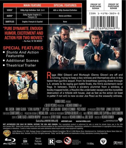 The series formula started to kick in with this immediate sequel to Lethal Weapon, but that doesn't necessarily make it a weak movie. Joe Pesci joins the fold, Richard Donner directs again, and Mel Gibson and Danny Glover return as LAPD partners, their relationship smoother now that Gibson's character has recovered from his maddening grief over his wife's death. But the reckless Mel and cautious Danny equation, good for a million laughs, settles into place in this story involving a South African smuggler and a new girlfriend (Patsy Kensit) for Gibson. The movie is hardly comfy, though. The last act gets nasty, and a climactic fight between Gibson (who gets the worst of it) and some high-kicking villain is ugly. The DVD release includes production notes, Dolby sound, theatrical trailer, optional full-screen and widescreen presentations, optional French soundtrack, and optional English, French, and Spanish subtitles.