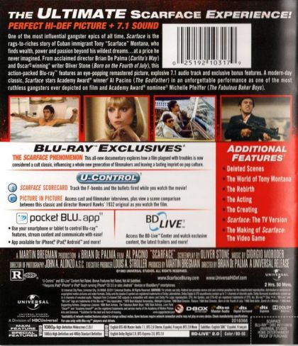 This sprawling epic of bloodshed and excess, Brian De Palma's update of the classic 1932 crime drama by Howard Hawks, sparked controversy over its outrageous violence when released in 1983. Scarface is a wretched, fascinating car wreck of a movie, starring Al Pacino as a Cuban refugee who rises to the top of Miami's cocaine-driven underworld, only to fall hard into his own deadly trap of addiction and inevitable assassination. Scripted by Oliver Stone and running nearly three hours, it's the kind of film that can simultaneously disgust and amaze you (critic Pauline Kael wrote "this may be the only action picture that turns into an allegory of impotence"), with vivid supporting roles for Steven Bauer, Michelle Pfeiffer, Mary Elizabeth Mastrantonio, and Robert Loggia. Universal's special edition digital video disc includes a documentary about the making of the film that features numerous interviews and several deleted scenes. --Jeff Shannon