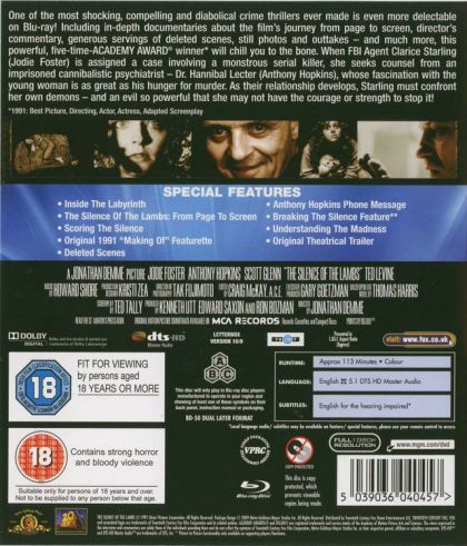Based on Thomas Harris's novel, this terrifying film by Jonathan Demme really only contains a couple of genuinely shocking moments (one involving an autopsy, the other a prison break). The rest of the film is a splatter-free visual and psychological descent into the hell of madness, redeemed astonishingly by an unlikely connection between a monster and a haunted young woman. Anthony Hopkins is extraordinary as the cannibalistic psychiatrist Dr. Hannibal Lecter, virtually entombed in a subterranean prison for the criminally insane. At the behest of the FBI, agent-in-training Clarice Starling (Jodie Foster) approaches Lecter, requesting his insights into the identity and methods of a serial killer named Buffalo Bill (Ted Levine). In exchange, Lecter demands the right to penetrate Starling's most painful memories, creating a bizarre but palpable intimacy that liberates them both under separate but equally horrific circumstances. Demme, a filmmaker with a uniquely populist vision (Melvin and Howard, Something Wild), also spent his early years making pulp for Roger Corman (Caged Heat), and he hasn't forgotten the significance of tone, atmosphere, and the unsettling nature of a crudely effective close-up. Much of the film, in fact, consists of actors staring straight into the camera (usually from Clarice's point of view), making every bridge between one set of eyes to another seem terribly dangerous. --Tom Keogh