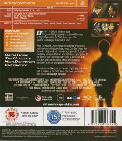 "I see dead people," whispers little Cole Sear (Haley Joel Osment), scared to affirm what is to him now a daily occurrence. This peaked 9-year old, already hypersensitive to begin with, is now being haunted by seemingly malevolent spirits. Child psychologist Malcolm Crowe (Bruce Willis) is trying to find out what's triggering Cole's visions, but what appears to be a psychological manifestation turns out to be frighteningly real. It might be enough to scare off a lesser man, but for Malcolm it's personal--several months before, he was accosted and shot by an unhinged patient, who then turned the gun on himself. Since then, Malcolm has been in turmoil--he and his wife (Olivia Williams) are barely speaking, and his life has taken an aimless turn. Having failed his loved ones and himself, he's not about to give up on Cole.