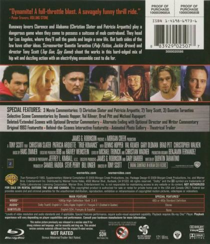 It was directed with energetic skill by Top Gun Tony Scott, but this breathtaking 1993 thriller (think of it as an adolescent crime fantasy on steroids) has Quentin Tarantino written all over it. True Romance is really part of a loose trilogy that includes Reservoir Dogs and Pulp Fiction, with a crackling Tarantino screenplay that rides a fine line between raucous comedy and violent excess. Christian Slater plays Clarence, the comic-book lover who meets a beguiling prostitute named Alabama (Patricia Arquette), confronts her vicious pimp (Gary Oldman), and embarks on a cross-country odyssey with $5 million worth of Mafia cocaine. Mayhem ensues, culminating in a favorite Tarantino climax--the "Mexican standoff"--in which a roomful of guys are pointing guns at each other, waiting to see who shoots first. Brutal, profane, and totally outrageous, True Romance is not for everyone, but with a supporting cast that includes Dennis Hopper, Christopher Walken, Brad Pitt, and Val Kilmer (as the ghost of Elvis!), you can be sure this movie will never be boring. --Jeff Shannon