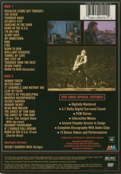 Call it Boss in a Box. This two-disc set of music videos and concert performances is a must for any Springsteen fan. While the 1989 VHS version contained just 18 songs, the expanded DVD set has 33 performances dating through 2000, including "The Ghost of Tom Joad," performed in 1995 on The Tonight Show, and an acoustic "Born in the U.S.A." from a 1998 appearance on The Charlie Rose Show. Most of the highlights are, not surprisingly, from Springsteen's electrifying concerts, including raw versions of "Rosalita" and "Thunder Road" from early in his career with the E Street Band. Also not to be missed: the 1987 performance of the harrowing "Tougher Than the Rest," shot with poignant close-ups of wife Patti Scialfa singing backup; the raspy, gospel- tinged "Leap of Faith"; and the barely contained smolder of "Fire." Most fans will find themselves wishing that this was strictly a concert DVD; the MTV videos from the Born in the U.S.A. years (the John Sayles-directed trilogy "Born in the U.S.A.," "I'm on Fire," and "Glory Days") seem too canned and glossy sandwiched in with the rougher, more exhilarating live performances. And Springsteen's tendency to get preachy in the late '90s ("Murder Incorporated," "Dead Man Walkin'") can grate as well. But until there's a full-length performance DVD, the Video Anthology will keep fans on their feet.