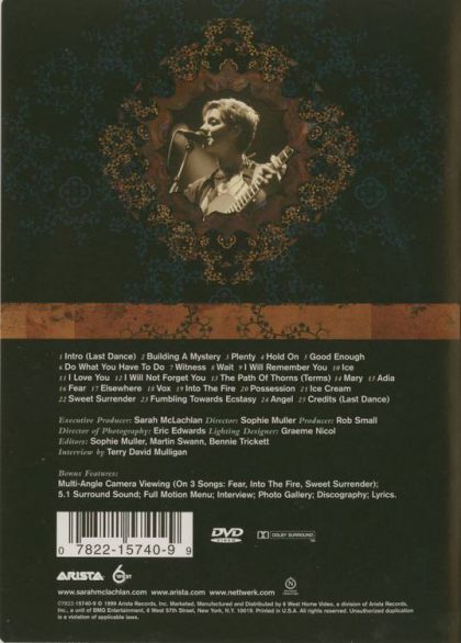 This video companion to the Canadian singer-songwriter's triumphant live album confirms in sight what that recording advanced in sound--Sarah McLachlan and her fine, flexible stage band have evolved into a superb live performing unit, breathing added fire and nuance into McLachlan songs that were already stunning in their original studio versions. Always a strong, charismatic singer, McLachlan now conjures a rare balance of delicacy and power, measured here in performances of signature songs that add a new, more muscular edge matching her band's rock firepower. Thus, "Possession" expands beyond its already sensual promise to touch on truly erotic abandon, while "Building a Mystery" focuses its portrait of a narcissistic poseur with a harder edge and a newly amended, R-rated lyric that's entirely appropriate.
