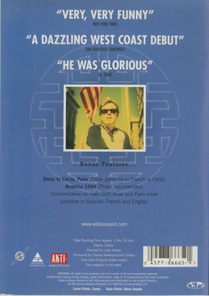 In Dress to Kill, Eddie Izzard spins free-flowing jokes about San Francisco (where the comedy concert was filmed), transvestitism, squirrels, American optimism, Hitler, the British royal family, mass murder, and Stonehenge--and that's only the first 30 minutes. It's as if this ingenious comedian says whatever comes off the top of his head, but giving that impression demands cunning and skill; Izzard romps through human history and transforms surprisingly complex ideas into biting satire--as well as knockout bits of sublime frivolity, like describing the movie Speed entirely in French. His mercurial patter is sprinkled with four-letter words, but his twinkling glances make this more mischievous than crude. Izzard has delivered some excellent performances in movies (like Velvet Goldmine and The Cat's Meow), but it's on stage that he really explodes with daffy wit and charisma. Simply brilliant and completely addictive; you will want to watch this over and over. --Bret Fetzer