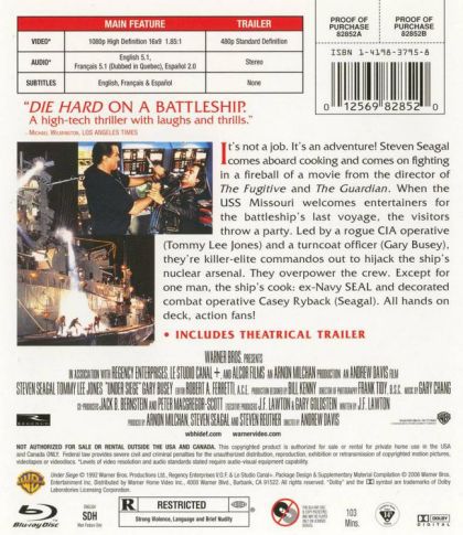 Steven Seagal can consider himself lucky if he ever makes a better movie than this one, which was appropriately dubbed "Die Hard on a battleship" when released in 1992. Seagal handles the heroic duties with his usual wooden efficiency, but the movie's greatest assets are a punchy script and the scene-stealing performances of Tommy Lee Jones and Gary Busey. The two play leaders of a terrorist group who take over the venerable battleship USS Missouri during its final commissioned voyage. They're crazed psychotics who seize control of the ship's nuclear arsenal, but they don't know that Seagal--as the ship's cook, no less--is a former Navy hero, lurking in the shadows and waiting to spoil their nefarious scheme. Director Andrew Davis (The Fugitive) helms the action with skillful style, and as the cheesecake stripper who proves handy with a hand grenade, Playboy Playmate-turned-actress Erika Eleniak gives Seagal another reason to strut his macho stuff. Under Siege is hormonal hokum for gun-happy viewers, but as action movies go, this one's a definite guilty pleasure. --Jeff Shannon