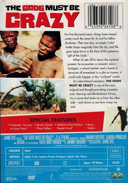 Kalahari bushman Xi (played by genuine bushman N!xau) is as surprised as the rest of his tibe when a Coke bottle, thrown from a passing plane, lands in the middle of their village. This "gift from the gods" proves to be a mixed blessing when the tribesmen fight over it and eventually use it for a weapon. To keep peace in the village, Xi is assigned to take the bottle to "the end of the earth" (actually a lush valley) and throw it back to the gods. Meanwhile, back in urbanized South Africa, Kate Thompson (Sandra Prinsloo) leaves her office job in the city to take a job teaching Kalahari children; once in the wilderness, she finds herself constantly bumping into clumsy microbiologist Andrew Steyn (Marius Weyers). And meanwhile, maniacal Sam Boga (Louw Verwey) is leading a military coup against the government. How do all these various and wildly divergent characters fit together? You'll have to see The Gods Must be Crazy yourself—if you haven't seen it already. This Botswanian comedy/melodrama was directed by Jamie Uys, who had helmed dozens of films before Gods and would make many more afterwards. Originally slated for limited domestic distribution in 1982, Gods Must Be Crazy was picked up for American consumption by 20th Century-Fox in 1984. Within a few weeks, "word of mouth" transformed Gods into the biggest foreign boxoffice hit ever released in the U.S. The 1989 sequel didn't do quite as well, indicating that perhaps the bloom was off the rose for N!xau and his confreres. — Hal Erickson