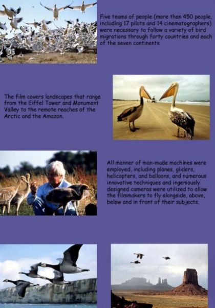 This beautiful film is not what it appears. It is a combination of fiction and documentary--documentary where wild birds were filmed, but staged where the feathered actors appear. And all was storyboarded and scheduled as best as could be managed during the four years of work it took to film it. The real story behind the film and the "people" of the French title "Le Peuple Migrateur" is told by the documentary "The Making of" that appears on the DVD. The humans are unseen in the film but fly with the actors they hand-raised from eggs and imprinted on themselves and their machines so they would stay with the people and follow directions ("Allez! Allez!"). The producer, who narrates the commentary on the DVD, describes the planning and making of this film as the fulfillment of a "dream," a dream to fly with the birds. This film gives hints of the extraordinary lengths to which this dream took its dreamers only in the seemingly impossible shots in which the viewer is at eye level with high-flying birds. Otherwise--except for the almost obviously staged plot elements where birds land in particular places in which they interact with machinery, vehicles, and people who do not speak--it appears to be a nature documentary, which it partly is.