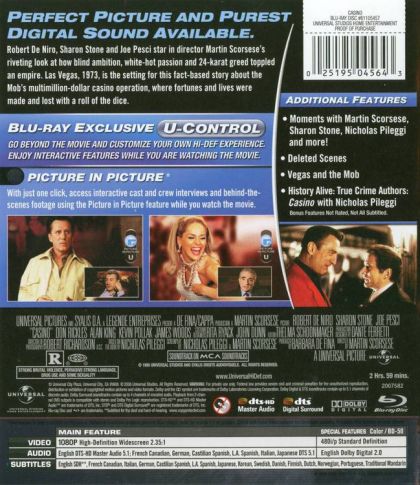 Director Martin Scorsese reunites with members of his GoodFellas gang (writer Nicholas Pileggi; actors Robert De Niro, Joe Pesci, and Frank Vincent) for a three-hour epic about the rise and fall of mobster Sam "Ace" Rothstein (De Niro), a character based on real-life gangster Frank "Lefty" Rosenthal. (It's modeled after on Wiseguy and GoodFellas and Pileggi's true crime book Casino: Love and Honor in Las Vegas.) Through Rothstein, the picture tells the story of how the Mafia seized, and finally lost control of, Las Vegas gambling. The first hour plays like a fascinating documentary, intricately detailing the inner workings of Vegas casinos. Sharon Stone is the stand out among the actors; she nabbed an Oscar nomination for her role as the voracious Ginger, the glitzy call girl who becomes Rothstein's wife. The film is not as fast paced or gripping as Scorsese's earlier gangster pictures (Mean Streets and GoodFellas), but it's still absorbing. And, hey--it's Scorsese! (Additional note: the digital video disc has a "layer switch," allowing you to watch the entire film without interruption.)