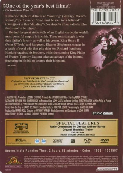Henry the II and Eleanor meet with their three surviving sons at Christmas to decide which of them should become the new king after Henry's death. Originally a stage play, the action is mostly in the speeches the people make. Each of the sons has some flaw that makes the decision difficult, but the pair have spent their lives fighting for position and even at the end can't possibly stop. Written by John Vogel {jlvogel@comcast.net}