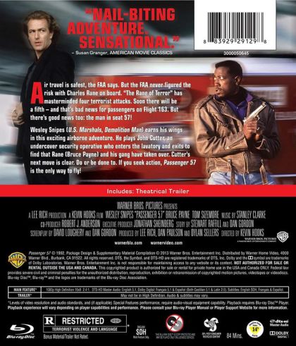 Air travel is the safest, the FAA says. But the FAA never figured the risk with Charles Rane on board. "The Rane of Terror" has masterminded four terrorist attacks. Soon there will be a fifth -- and that's bad news for the passengers on Flight 163. But there's good news too: the man in seat 57! Wesley Snipes plays John Cutter, an undercover security operative who enters the lavatory and exits to find Rane (Bruce Payne) and his gang have taken over. Cutter's next move is clear. Do. Or be done to.