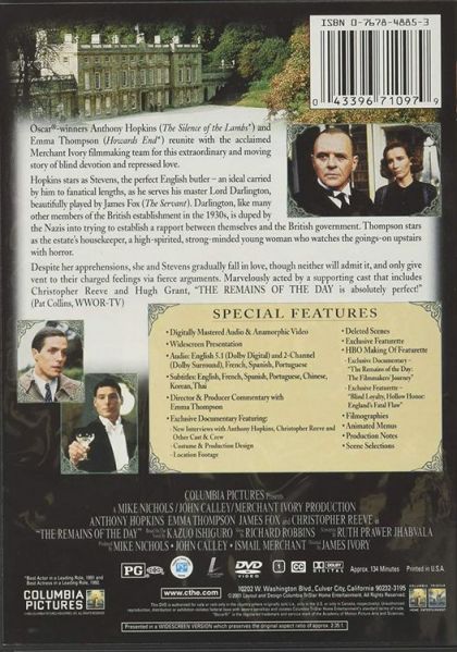 A rule bound head butler's world of manners and decorum in the household he maintains is tested by the arrival of a housekeeper who falls in love with him in pre-WWI Britain. The possibility of romance and his master's cultivation of ties with the Nazi cause challenge his carefully maintained veneer of servitude. Written by Keith Loh {loh@sfu.ca}