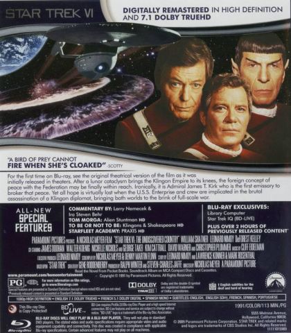 It's all for one and one for all as Kirk and the crew of the Enterprise-A set course for the stars in their final adventure. The Klingon Empire has been one of the Federation's deadliest enemies for nearly a century. All of that changes when their key energy production facility, the moon Praxis, explodes, damaging the Klingon homeworld's atmosphere and meaning that all ozone will be depleted in 50 years. Unable to the cope with this disaster due to their massive military expenditures, the Empire seeks peace talks with the Federation in order to receive aid. However, Kirk is opposed to the peace talks; it has been eight years since his son David was killed at the Genesis planet and he has never been able to forgive the Klingons for it. But he is a Starfleet officer and must escort Kronos One, the ship carrying Klingon Chancellor Gorkon, to Earth. But while en route, Kronos One is fired upon and Gorkon is assassinated. All evidence points to the Enterprise-A as the source of the photon torpedoes and Kirk and McCoy as the assassins, who are subsequently arrested, tried and sentenced to life at the gulag Rura Penthe. But Spock is certain that Kirk and the Enterprise-A have been framed and with the aid of senior staff as well as help from Sulu, now captain of the Excelsior, set out to clear Kirk's name and cement a lasting peace between the United Federation of Planets and the Klingon Empire before all is too late. Written by Moriarty1701@aol.com