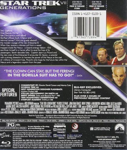 In the late 23rd century, the gala maiden voyage of the third Starship Enterprise (NCC-1701-B) boasts such luminaries as Pavel Chekov, Montgomery Scott and the legendary Captain James T. Kirk as guests. But the maiden voyage turns to disaster as the unprepared ship is forced to rescue two transport ships from a mysterious energy ribbon. The Enterprise manages to save a handful of the ships' passengers and barely makes it out intact... but at the cost of Captain Kirk's life. Seventy-eight years later, Captain Jean-Luc Picard and the crew of the Enterprise-D find themselves at odds with the renegade scientist Tolian Soran... who is destroying entire star systems. Only one man can help Picard stop Soran's scheme... and he's been dead for seventy-eight years.