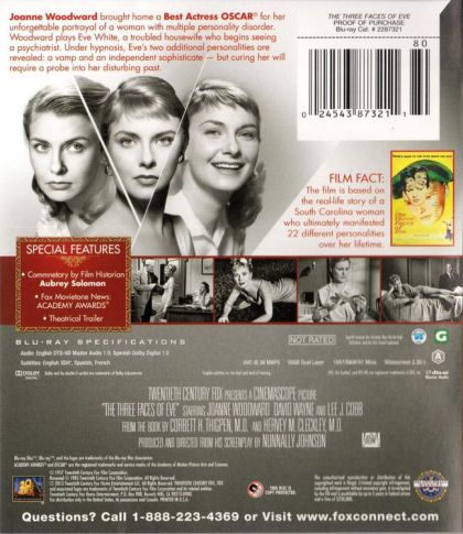 Eve White is a quiet, mousy, unassuming wife and mother who keeps suffering from headaches and occasional black outs. Eventually she is sent to see psychiatrist Dr. Luther, and, while under hypnosis, a whole new personality emerges: the racy, wild, fun-loving Eve Black. Under continued therapy, yet a third personality appears, the relatively stable Jane. This film, based on the true-life case of a multiple personality, chronicles Dr. Luther's attempts to reconcile the three faces of Eve. multiple personalities.