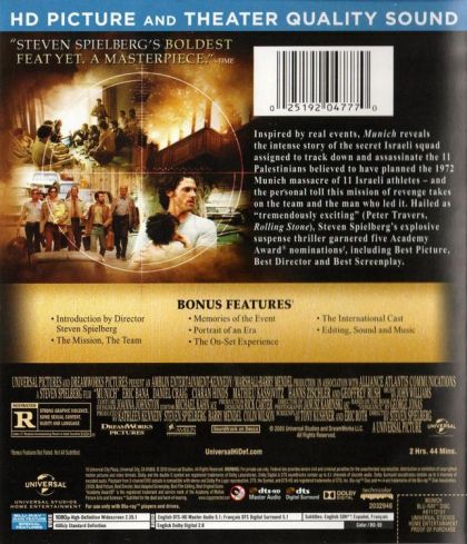 By all rights, Munich should be an unqualified success--it has gripping subject matter relevant to current events; it was co-written by one of America?s greatest living playwrights (Tony Kushner, Angels in America) and an accomplished screenwriter (Eric Roth); it stars an appealing and likeable actor in Eric Bana; and it was helmed by Steven Spielberg, of all people. While it certainly is a great movie, it falls just short of the immense heights such talent should propel it to. This is due more to some questionable plot devices than anything else (such as the contrived use of a family of French informants to locate the terrorists). But while certain aspects ring hollow, the movie as a whole is a profound accomplishment, despite being only "inspired by true events," and not factually based on them. From the ferocious beginning to the unforgettable closing shot, Munich works on a visceral level while making a poignant plea for peace, and issuing an unmistakable warning about the destructive cycle of terror and revenge. As one of the characters intones, "There is no peace at the end of this." --Daniel Vancini