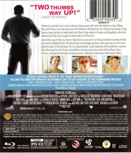 Nicolas Cage plays as an obsessive-compulsive con artist with his partner Sam Rockwell. During the first hour, they show the tricks of the con artist trade of how they scam people out of their money without using a gun. They are selling $50 water filters to people for over $300 and promising them that they have won a big prize, which they will never receive. As they are about to pull off a really big con, Alison Lohman, who is the 14-year-old daughter of Cage, arrives. She has never seen her father and now she has put the big swindle in jeopardy. However, Cage puts her to work and turns her into a little con artist.