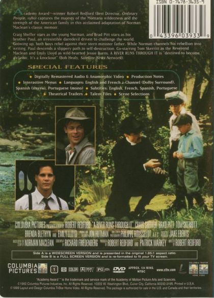 A lyrical and nostalgic film from director Robert Redford (Quiz Show, Ordinary People), based on the popular autobiographical novel by Norman MacLean, A River Runs Through It shows the best that modern filmmaking has to offer. The film chronicles two brothers coming of age in early-20th-century Missoula, Montana, under the stern tutelage of their minister father, played by Tom Skerritt (Top Gun). Their father instills in them a love of fly fishing, which for one brother (Brad Pitt) becomes a lifelong passion even as he sets out to become a newspaperman and struggles with his addiction to gambling. The other brother, Norman (Craig Sheffer), dreams of exploring the world outside of Missoula as he falls in love with a local girl (Emily Lloyd) who also dreams of broader horizons. Soon one brother must discover the true meaning of family loyalty when the other finds himself in deeper trouble than ever before. Redford, who also narrates the film, does a masterful job in re-creating the period and in drawing out affecting performances from his young cast. An Oscar winner for Philippe Rousselot's luminescent cinematography, this is a poignant and special film. -- Robert Lane