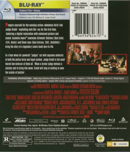 In a standard comic book dystopian near-future Americans are ensconced in mega-cities which protect them from the desolation of the world outside, and the peace is kept by The Judges. This elite group who upholds "The Law" is police, jury, and executioner all in one. Judge Dredd, the most formidable and revered of the Street Judges, is convicted of the murder of a snooping reporter. With the help of a prisoner who he himself convicted, Dredd sets out to clear his name while leaving a trail of destruction, snappy catch- phrases, and dazzling special effects in his wake. Written by T.C. Johnston