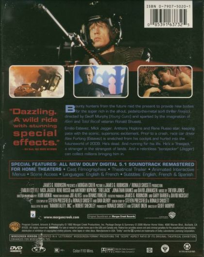 “Freejack” is a film about a racer named Alex Furlong (Emilio Estevez) who is abducted by means of a time travel device seconds before his fatal accident in the present-day of 1991. A technological team led by Victor Vasendak (Mick Jagger) yanked Alex from his proper time to sell his healthy body to a dying millionaire named Ian McCandless (Anthony Hopkins) who will use him for a mind transfer. Alex escapes only to discover he is in a war-torn future where there are few civil rights. Now he must survive, dodge Vasendak’s goons and repair his broken relationship with his fiancée Julie Redlund (Rene Russo) who is also McCandless’ right hand executive.