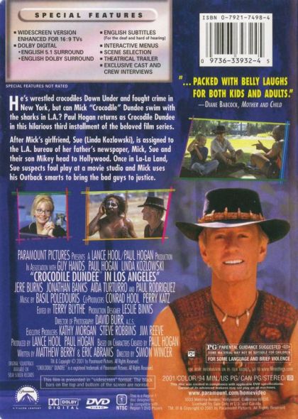 From the opening shot of a Jurassic Park-esque reptilian eye, one knows one is in for a wild ride. As Mick "Crocodile" Dundee sits in a boat sharpening his famous knife, a monstrous croc hides somewhere in the deep. Suddenly, it attacks, tearing Mick's boat to pieces and leaving him and eventually his mate Jacko up a tree. Life for Mick can only get easier, right? When Mick arrives at home, he discovers longtime companion Sue's newspaper-mogul father has called, and needs her help as the temporary publisher of the Los Angeles bureau. Mick, who recognizes his importance in the modernizing bush is now no more than as a tourist attraction, agrees to join her, and together Mick, Sue, and son Mikey head for the wild country of L.A. Here the adventure truly begins, as Mick and Jacko brave a cowboy bar where the horsemen are of a different color, and a Hollywood film party where everyone seems interested in Mick's mate Malcolm "Mal" Gibson's colorful exploits. Soon, Sue's article leads to a sleazy film producer, so Mick gets a job as a second at his studio, where his investigation uncovers some very sketchy goings-on.