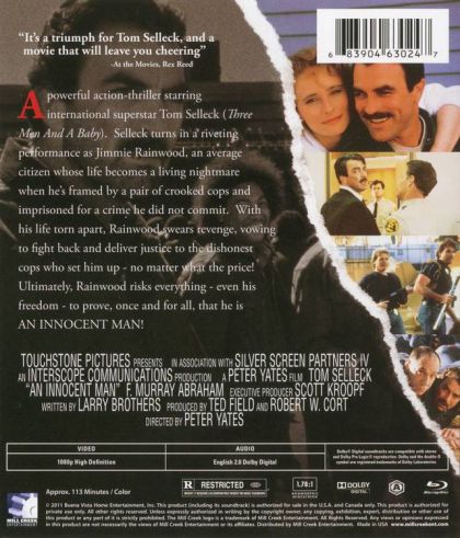 An Innocent Man is the story of Jimmie Rainwood (Tom Selleck) a man who lives his life upholding the law. One day two police officers burst into his house and gun him down; they plant drugs in his house and frame him as drug dealer. It is apparent that Jimmie was the victim of police corruption as he was falsely convicted of drug trafficking after an especially mysterious trial and false testimony by a police informant. Jimmie is sent to prison and must now not only struggle to prove his innocence and implicate the police officers, but also survive brutal prison life and its mortal dangers.