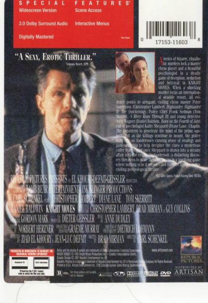 Knight Moves is the story of an exceptional chess player named Peter Sanderson (Christopher Lambert) who, along with his lover, travels to participate in one of the world’s most prestigious chess tournaments. One night he comes home from the tournament to find his girlfriend brutally murdered. He is at first implicated in the crime as the murderer, but he is able to prove his innocence to the police. That night, he is phoned by the actual killer who entices him to play a game with him that has grave stakes and fatal consequences. Peter agrees and with the help of police captain Frank Sedman (Tom Skerritt) begind to stalk the killer.