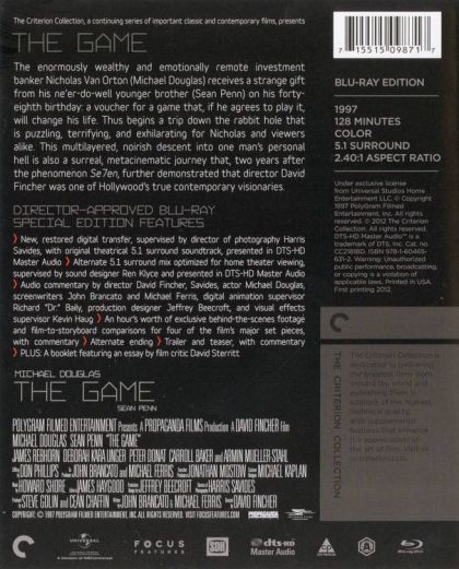 The main character of The Game, Nicholas Van Orton (Douglas), is a successful businessman, but his success has come at the cost of his family life. When the movie opens, he is divorced, distant from his caring ex-wife and cold toward his only living relative, his kid brother, Conrad (Penn). Nicholas goes about life in a cold, detached manner and seems incapable of expressing emotion or caring for anyone outside of himself.