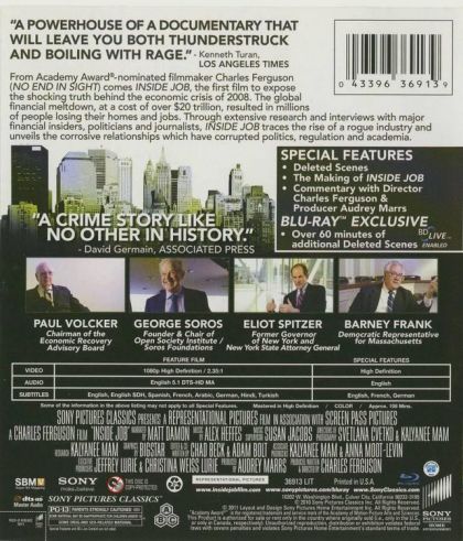 A film that exposes the shocking truth behind the economic crisis of 2008. The global financial meltdown, at a cost of over $20 trillion, resulted in millions of people losing their homes and jobs. Through extensive research and interviews with major financial insiders, politicians and journalists, Inside Job traces the rise of a rogue industry and unveils the corrosive relationships which have corrupted politics, regulation and academia.