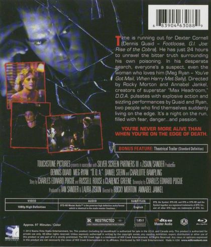 D.O.A is the story of a washed up English College Professor, Dexter Cornell (Dennis Quaid) who finds the people around him who are close to him have been murdered. It all began with Nick Lang (Robert Knepper) who Dexter passed along a manuscript to read. Nick ends up dead only to have Nick traced back to an affair with his wife. One by one a new murder leads back to Dexter himself. However now, Dexter has become the prime suspect and also prime victim. Someone has just slipped something deadly into Dexter’s drink and poisoned him. Now Dexter has only 24 hours to find out who and how to stop it. Along the way, Dexter takes up a partnership with one of his students, Sydney Fuller (Meg Ryan) who helps him deal with his search in more ways than one.