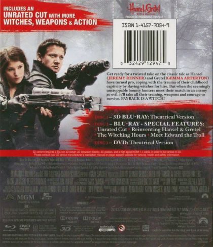 Abandoned by their father deep in a forest one night, young Hansel (Cedric Eich) and Gretel (Alea Sophia Boudodimos) enter a gingerbread house and are quickly nabbed by the old witch who resides in it. The witch forces Hansel to continuously eat candy while making Gretel prepare the oven, but before she has a chance to eat them, the siblings outsmart her and throw her into the oven. Throughout the years after the incident, Hansel (Jeremy Renner) and Gretel (Gemma Arterton) become ruthless bounty hunters dedicated to exterminating witches. Their work is relatively easy because for an unknown reason, they are immune to harmful witch spells and curses. Hansel, however, is diabetic as a result of his ordeal with the old witch and needs to take a regular shot of insulin every day.