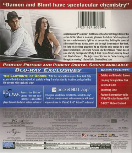Do we control our destiny, or do unseen forces manipulate us? A man glimpses the future Fate has planned for him and realizes he wants something else. To get it, he must pursue across, under and through the streets of modern-day New York the only woman he's ever loved. On the brink of winning a seat in the U.S. Senate, ambitious politician David Norris (Damon) meets beautiful contemporary ballet dancer Elise Sellas (Emily Blunt) - a woman like none he's ever known. But just as he realizes he's falling for her, mysterious men conspire to keep the two apart. David learns he is up against the agents of Fate itself - the men of The Adjustment Bureau - who will do everything in their considerable power to prevent David and Elise from being together. In the face of overwhelming odds, he must either let her go and accept a predetermined path...or risk everything to defy Fate and be with her.