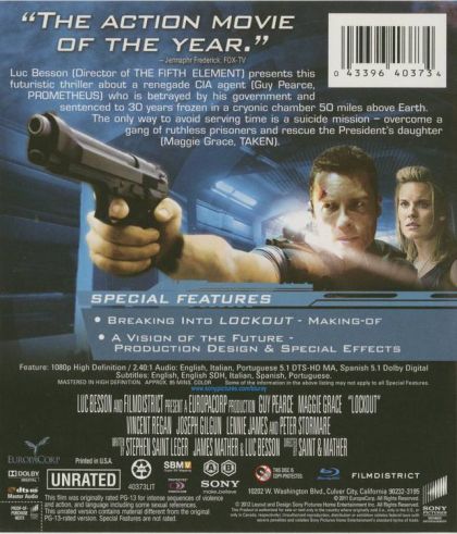 Set in the near future, Lockout follows a falsely convicted ex-government agent (Pearce), whose one chance at obtaining freedom lies in the dangerous mission of rescuing the President's daughter (Grace) from rioting convicts at an outer space maximum security prison.