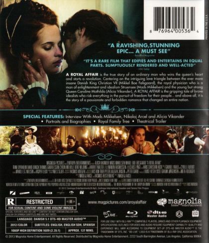 In 1767, the British Princess Caroline is betrothed to the mad King Christian VII of Denmark, but her life with the erratic monarch in the oppressive country becomes an isolating misery. However, Christian soon gains a fast companion with the German Dr. Johann Struensee, a quietly idealistic man of the Enlightenment. As the only one who can influence the King, Struensee is able to begin sweeping enlightened reforms of Denmark through Christian even as Caroline falls for the doctor. However, their secret affair proves a tragic mistake that their conservative enemies use to their advantage in a conflict that threatens to claim more than just the lovers as their victims.