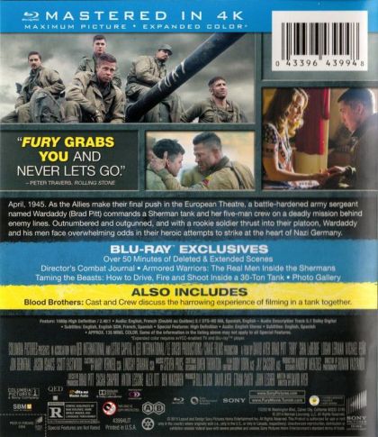 April, 1945. As the Allies make their final push in the European Theatre, a battle-hardened army sergeant named Wardaddy (Brad Pitt) commands a Sherman tank and her five-man crew on a deadly mission behind enemy lines. Out-numbered, out-gunned, and with a rookie soldier thrust into their platoon, Wardaddy and his men face overwhelming odds in their heroic attempts to strike at the heart of Nazi Germany.