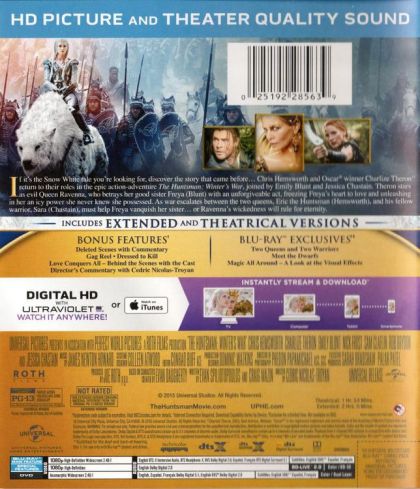 Devastated by a cruel and terrible betrayal, the evil sorceress Queen Ravenna's once-kind younger sister, Freya, renounces love and sees her dormant magical powers emerge. Transformed into an all-powerful Ice-Witch with a frozen heart, Freya retreats to her new kingdom in the North, devoting all her energy to raising a large and invincible army of orphans from the conquered lands: her mighty Huntsmen. However, in this icy realm where love is a sin, two dauntless warriors--Eric and Sara--dare to defy the queen's decree and fall for each other, only to face the disastrous consequences. Now, more and more, the sinister black magic that imbues wicked Ravenna's gold Magic Mirror becomes stronger. Is there a way to stop the advent of the indefatigable dark adversary?