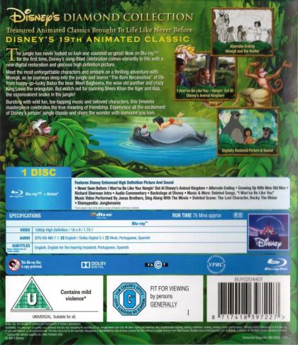 The Jungle Book follows the ups and downs of the man-cub Mowgli as he makes his way back to the human village with wise panther Bagheera to escape ruthless tiger Shere Khan. Along the way, he meets unforgettable friends and foes including mad King Louie of the Apes, the hypnotic snake Kaa and the loveable, happy-go-lucky bear Baloo, who teaches Mowgli about true friendship.