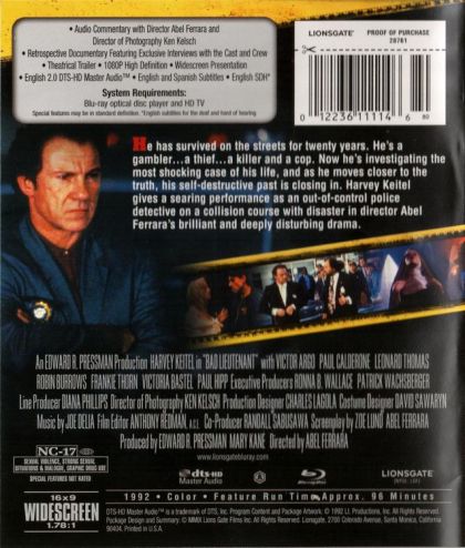 Harvey Keitel plays a nameless corrupt New York police lieutenant (all of the characters in the movie do not seem to have names) who struggles with his personal demons and various addictions. In the opening scene, the Lieutenant (known only as LT) drives his two twin sons from their house somewhere in suburban New York City (either the Bronx or Queens) to their Catholic elementary school where he firmly tells them to respect one another and not to get into trouble. After dropping off his two sons at their school, the Lieutenant snorts some cocaine that he has on him.
