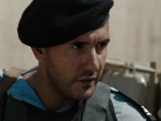 Back at the base perimeter, Sgt. James confronts an Iraqi kid who sells pirated DVDs to the soldiers. The boy, who kicks a soccer ball around and calls himself Beckham, had sold James a movie a few days before; James wants his $5 back because the DVD was poor in quality. When Beckham tries to hustle him further, James is amused and tells him he can keep the money if he's able to block a shot at the makeshift goal area Beckham has set up. Beckham blocks the shot and James agrees to buy another movie from him, mildly threatening him if it's defective.