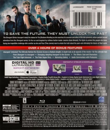 INSURGENT raises the stakes for Tris as she searches for allies and answers in the ruins of a futuristic Chicago. Tris (Woodley) and Four (James) are now fugitives on the run, hunted by Jeanine (Winslet), the leader of the power-hungry Erudite elite. Racing against time, they must find out what Tris's family sacrificed their lives to protect, and why the Erudite leaders will do anything to stop them. Haunted by her past choices but desperate to protect the ones she loves, Tris, with Four at her side, faces one impossible challenge after another as they unlock the truth about the past and ultimately the future of their world.