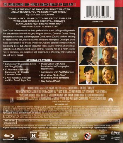 During the week he turns 33, NYC magazine publisher David Aames, a playboy who has strange dreams, spends a night of passion with Julie, "a friend he sometimes sleeps with," and a night with Sofia, a witty, knowing dancer with a Spanish accent - a night with intimations of love. David is charming, rich (his mother's Monet, "Vanilla Sky" is in his bedroom), and feckless: he inherited the magazines and his minority partners want him out. Jump ahead: he's in jail, wearing a prosthetic mask, talking to a sympathetic psychologist to get at the truth behind a death. Who has died? How? And who's Ellie? Popping up often on TV is Benny, a dog who survived for months frozen in ice.