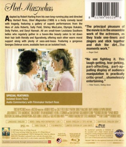 Revolving around Truvy's Beauty Parlor in a small parish in modern-day Louisiana, STEEL MAGNOLIAS is the story of a close-knit circle of friends whose lives come together there. As the picture opens, we find Drum Eatenton shooting birds in the trees of his back yard in preparation for his daughter's wedding reception that afternoon. Shortly thereafter, M'Lynn and Shelby (Drum's wife and daughter) depart for Truvy's to get their hair done for the wedding. "Just the sweetest thing," Annelle Depuy Desoto (who may or may not be married because her marriage may not be legal) is introduced to Truvy's customers as her new "glamour technician." While in the chairs, the sour-tempered Ouiser Boudreaux shows up and entertains the assemblage with her barbs. It seems that the only one of the group who truly understands Ouiser is Clairee who is recently widowed and looking for a diversion. As she says, later in the picture, "If you can't find anything good to say about anybody, come sit by me." Filled with humor and heartbreak, these "Steel Magnolias" make us laugh and cry as the realities of their lives in tiny Chiquapin Parish unfolds.