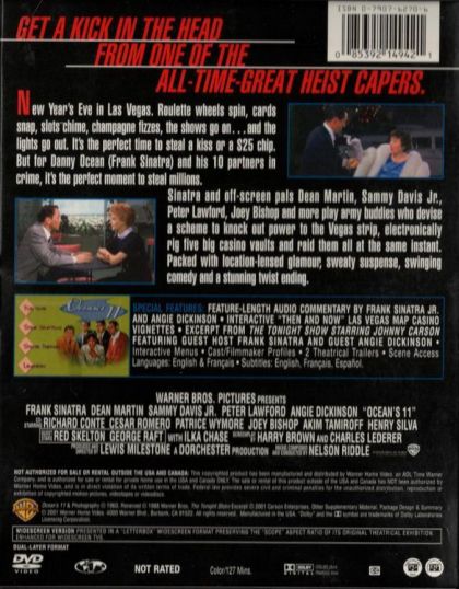 A gang of World War II 82nd Airborne veterans are recruited by Danny Ocean (Sinatra) and Jimmy Foster (Lawford) to rob five different Las Vegas casinos (Sahara, Riviera, Desert Inn, Sands, and The Flamingo) on a single night.
