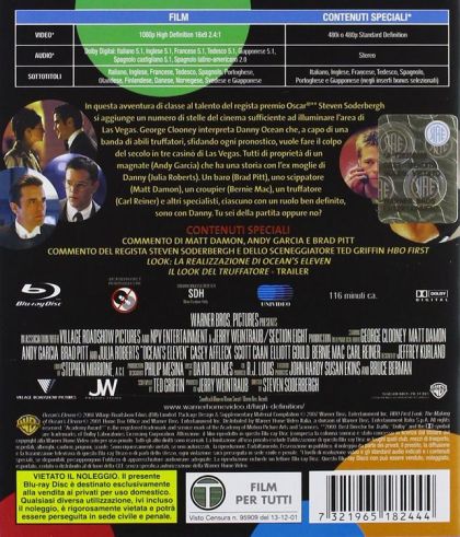 A rag-tag group of con artists and ex-cons team up for the heist to end all heists in this high-profile remake of the 1960 Rat Pack favorite. As with its predecessor, Ocean's Eleven opens with its titular hero Danny Ocean (George Clooney stepping into the Frank Sinatra role) eager for a new challenge. The similarities to the original end there, as Ocean conspires with his old pal Rusty Ryan (Brad Pitt) to rob 150 million dollars from an underground vault that serves three of Las Vegas' biggest casinos. Between the two of them, they recruit nine other men, each with his own criminal specialty, to assist in the mission: money-man Reuben Tishkoff (Elliot Gould), card dealer Frank (Bernie Mac), pickpocket Linus (Matt Damon), aging con artist Saul (Carl Reiner), British explosives pro Basher (Don Cheadle), techie Dell (Eddie Jemison), rude-boy brothers Virgil (Casey Affleck) and Turk (Scott Caan), and professional acrobat Yen (Shaobo Qin). What Ocean doesn't tell the group is that there's another reason he's coordinating the heist: the three casinos they're robbing are all owned by ruthless gambling mogul Terry Benedict (Andy Garcia), who just happens to be married to Ocean's former love Tess (Julia Roberts).